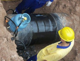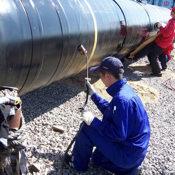 在施工时,将管道预热,用机器或手工缠绕在处理过的管道上,保证搭接宽度不小于25mm,均匀加热带材,带材在径向方向均匀收缩,同时热熔胶熔化。填充和包覆在管道上,形成牢固连续的管道外防腐层,可以抵抗土壤应力,抗静水压力,抗阴极剥离,抗化学腐蚀和霉菌侵蚀等多种腐蚀行为,为钢制管道提供长期、有效的保护。